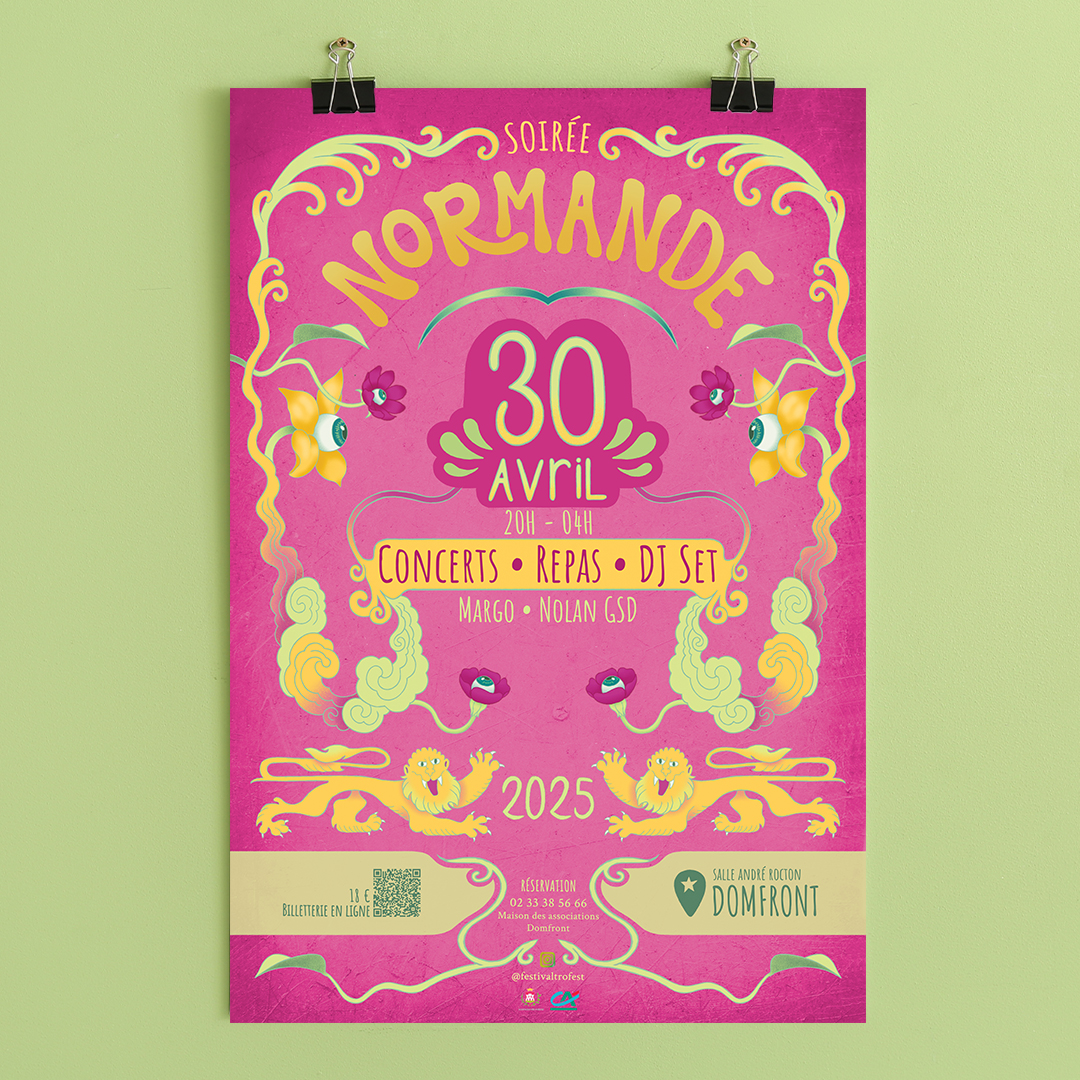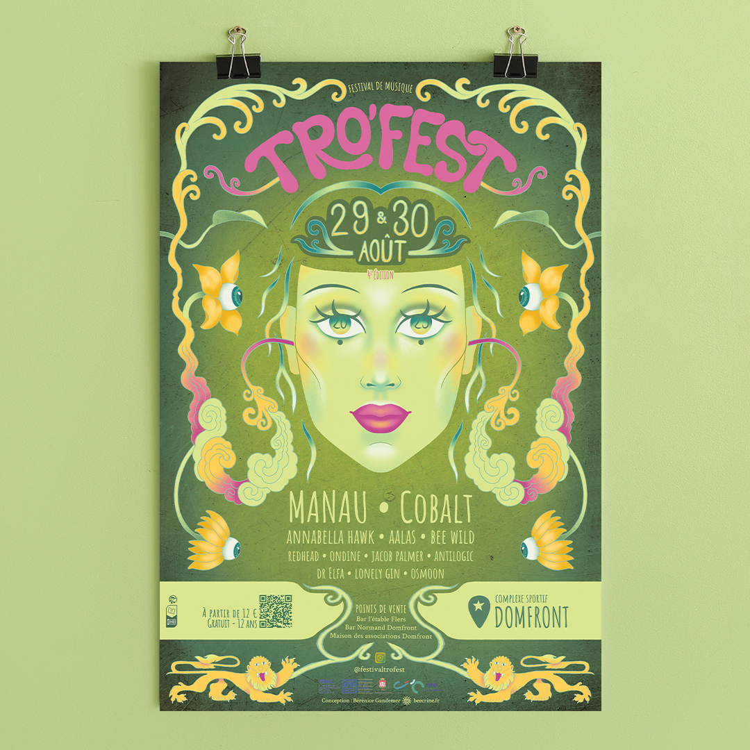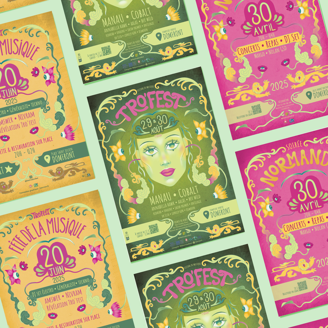 J’ai eu le plaisir de réaliser la direction artistique de la 4e édition du festival Tro’fest. Les affiches, colorées et dynamiques, capture l’énergie unique du festival. J’ai également conçu les visuels pour les réseaux sociaux, les écocups, ainsi que les illustrations pour le merchandising, afin de garantir une cohérence graphique sur l’ensemble des supports.